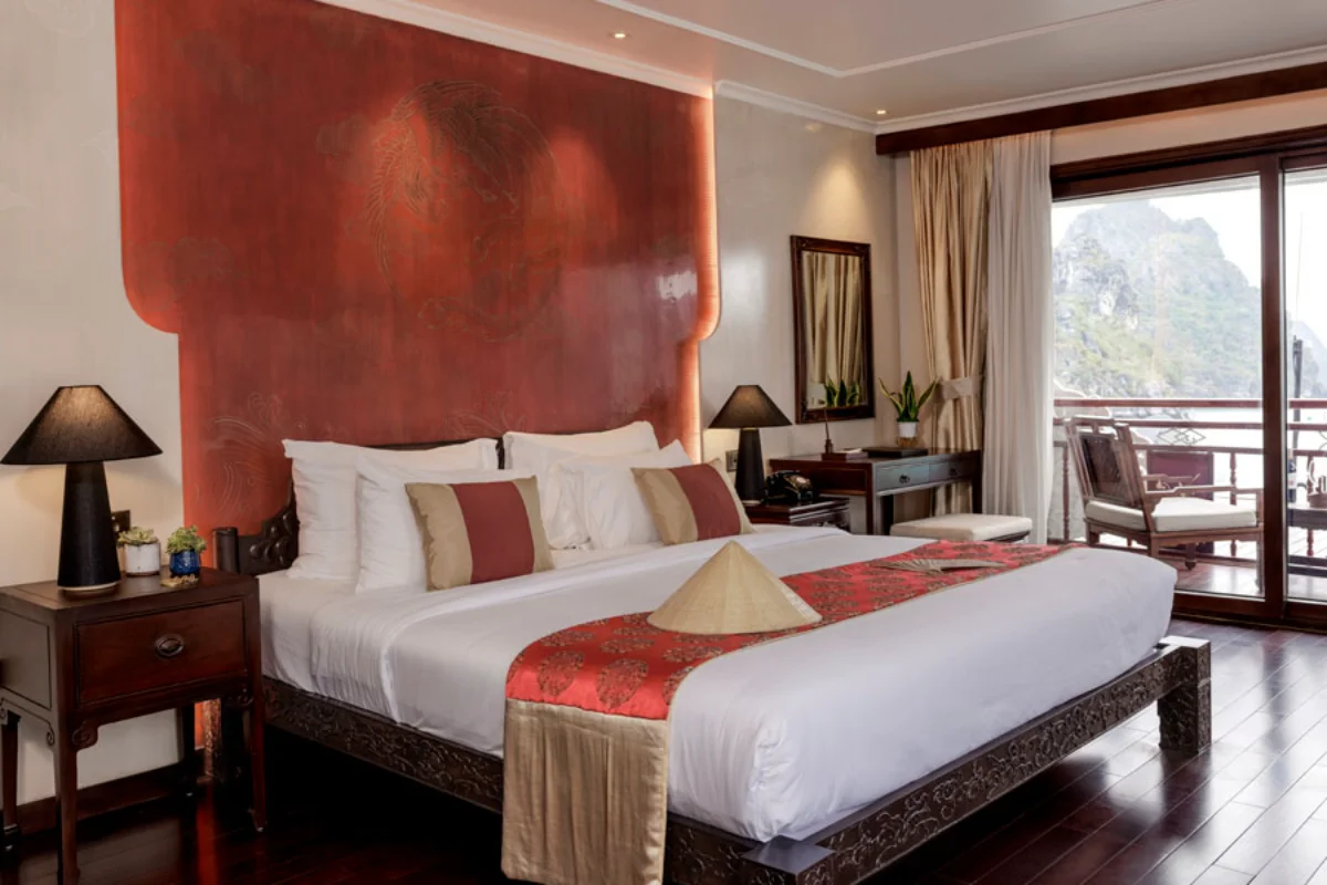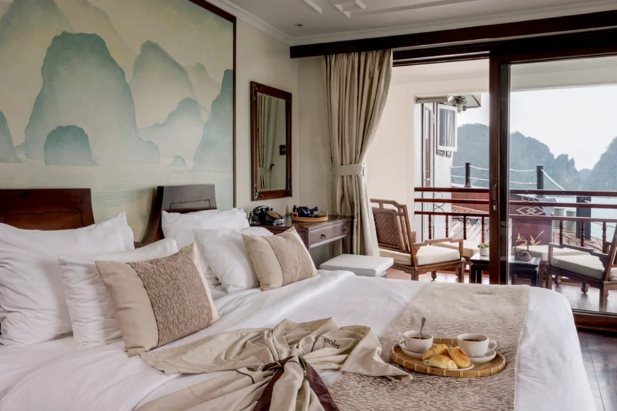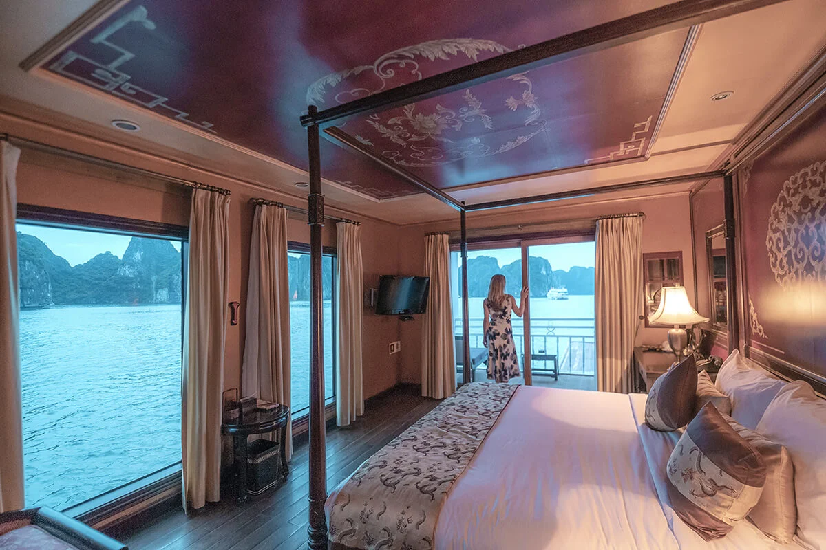 As you step aboard, the captain and your private butler greet you by name. You are escorted to your suite – one of only a few on the ship. The door opens to reveal a sanctuary of Indochine elegance: polished teak, silk cushions, and a king-size bed draped in fine linens. Rose petals are scattered on the bed, and a handwritten love note welcomes you. A bottle of vintage champagne rests in an ice bucket beside a platter of fresh strawberries. This is the start of your dream Halong Bay honeymoon.