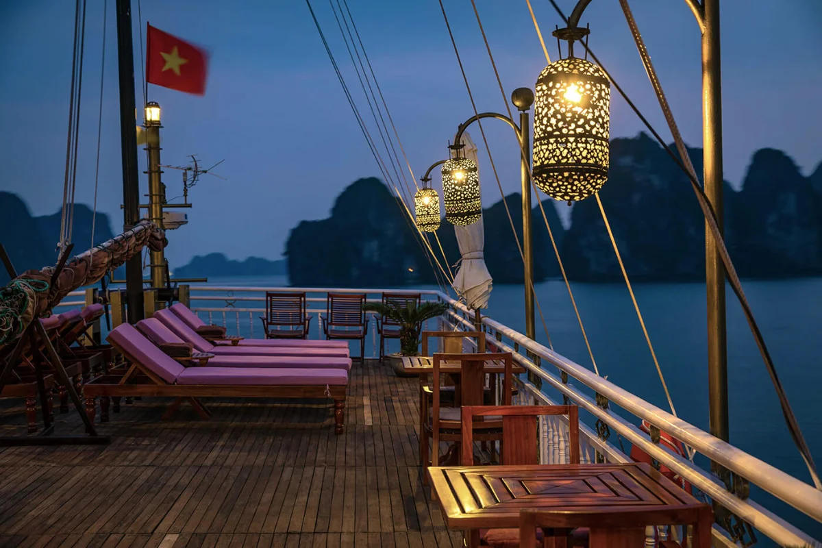 | 9:00 PM – 10:30 PM | Stargazing from Your Private Balcony – Relax in your suite’s jacuzzi with a glass of champagne, watching the stars reflect on the calm waters of Halong Bay. |
