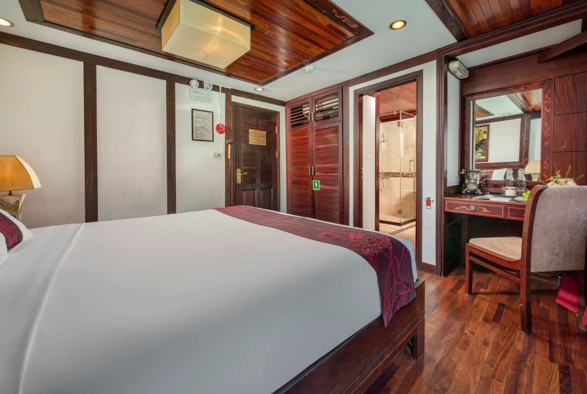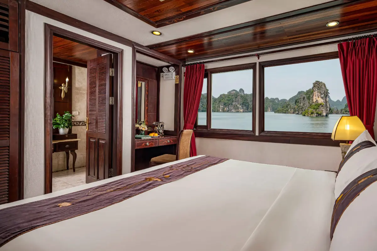 As you step aboard, the captain and your dedicated butler welcome you by name. You are escorted to the Indochina Sails Signature Suite – a spacious 42-square-meter cabin with large windows, a king-size bed dressed in fine linens, and a private balcony. Rose petals adorn the bed, and a handwritten love note welcomes you. A bottle of vintage champagne and fresh fruit await, setting the tone for your romantic Halong Bay honeymoon aboard this classic luxury cruise.