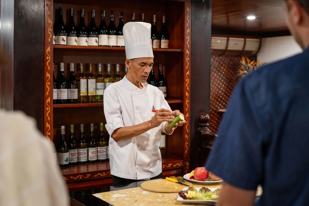 | 5:00 PM – 6:30 PM | Sunset Cocktail Hour – Reserved table on the bow sundeck. Signature “Indochina Breeze” cocktails: passion fruit and ginger. Dedicated butler. |
