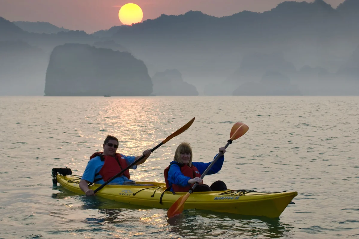 | 3:00 PM – 4:30 PM | Private Kayak to a Hidden Lagoon – A two-person kayak takes you through a dark cave tunnel into a jade-green lagoon, completely private and surrounded by towering cliffs. A quintessential Indochina Sails honeymoon moment. |